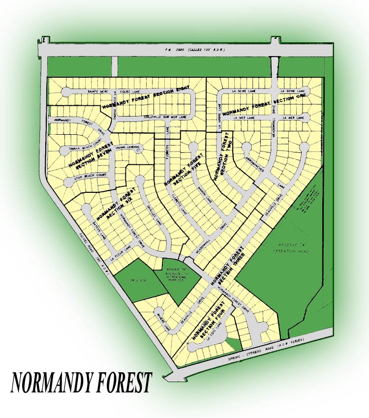 Normany Forests is a 142 acre residential development located on both FM 2920 and Spring Cypress Road, near Klein Collins High School in north Harris County. Opened in 1995, all 531 lots and homes have been sold. Imperial Homes, Meritage Homes and Plantation Homes built homes in Normandy Forest valued from $150,000 to $280,000.